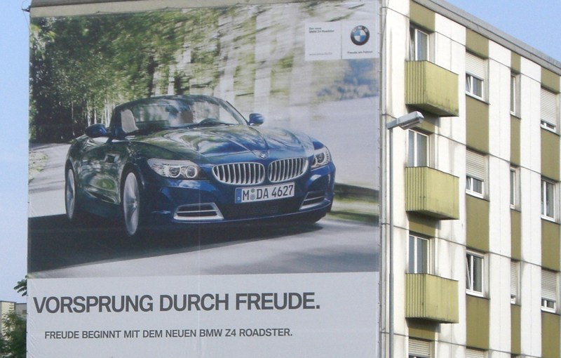 Razbunarea a fost insa pe masura, acum o luna. BMW a lansat campania mondiala de reclame cu Bucuria de a conduce. Si au decis sa o aplice inclusiv pe laterala unei cladiri exact de la intrarea in fabrica Audi. Progres prin tehnologie e sloganul Audi, iar reclama scria Progres in bucurie. Viva BMW!!!